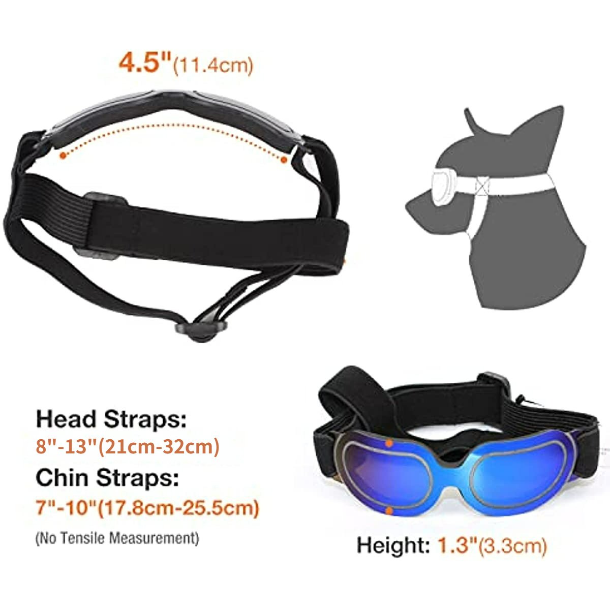 Enjoying small dog sunglasses made of PE frame; the sunproof coating on the super-hard lens would block UV rays out into and hurt your puppy eyes. Soft mats at the edge of the inner frame make your doggy around the eyes more comfortable. UV proof; anti-fog; windproof; waterproof; in summer walking; cycling; driving; riding; also snowproof; block wind in winter skiing; running.UV proof; anti-fog; windproof; waterproof; in summer walking; cycling; driving; riding; also snowproof; block wind in winter skiing; running. Only about 0.04lb; these puppy goggles are super lightweight; Height 1.3"; Length 4.5". Head strap elastic 8"-13"; Chin strap elastic 7"-10"; No tensile measurement; have enough to adjust; fit puppies like Yorkie; Pomeranian; Silky terrier; etc. Flexible straps need to be adjusted and tightened to get the dog sunglasses snug; if not; they easily move all over your dog snout and touch their eyes give rise to don't fit snug. When you first time put the sunglasses on your dog; maybe he/she kept trying to shake them off; you need to take your puppy got outside in the bright light or watering place then put them back; It's like it clicked him/her; he/she realized these were helping him/her; and he/she will quite contentedly wear them.